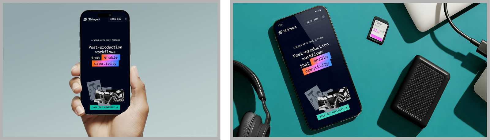 For Stringout, a post-production workflow tool built for video editors, a generic laptop on a white desk would have said absolutely nothing. Stringout's identity was built around a specific idea: that AI should free editors, not replace them. The brand drew from the visual language of the editing timeline, the rectangles, the gradients, and the color palettes editors recognize at a glance. The images needed to live in that same world, so the visuals included dark surfaces and dramatic lighting that mimicked a real post-production suite, contextual props like SD cards and cables sitting off to the side, familiar UI elements, gradients, and palettes pulled straight from editing timelines. Nothing in those images could have come from a Google search for "laptop mockup."