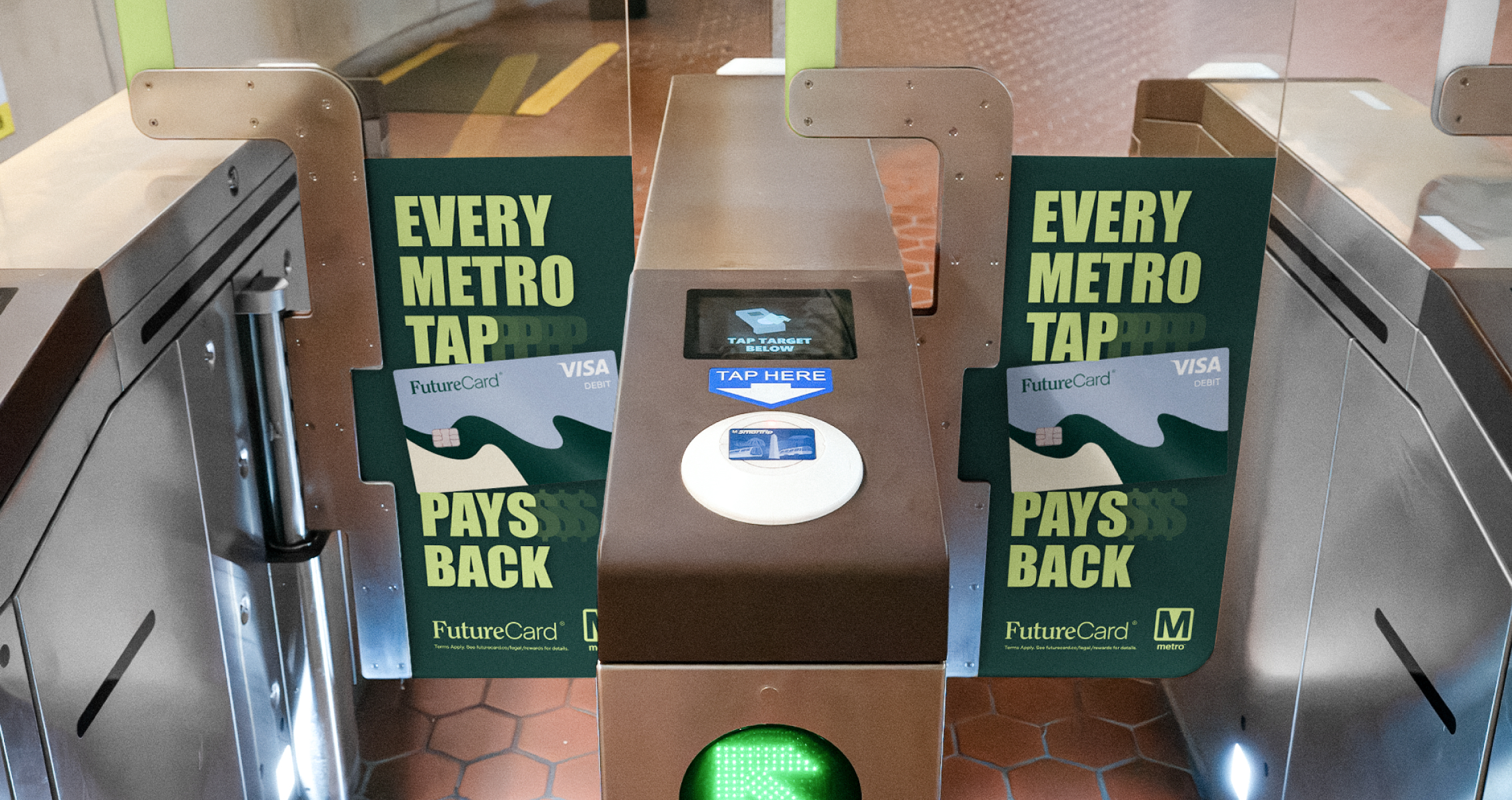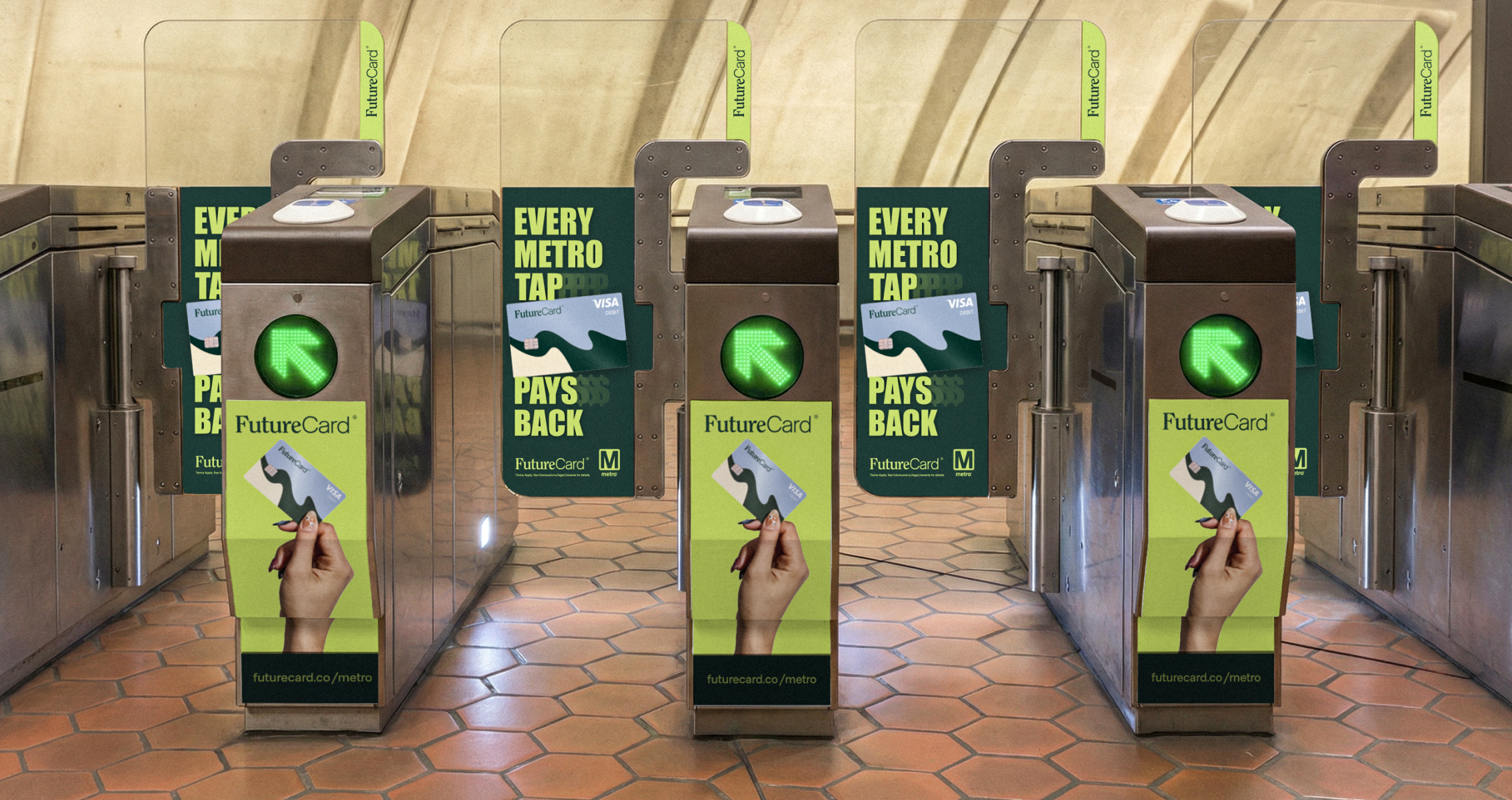 In 2025, Washington D.C. rolled out its new tap-to-pay turnstiles in metro stations across the city, and FutureCard was positioning themselves as their official partner. D.C. commuters could now tap any credit or debit card to enter the subway, not just their SmarTrip Metro Card. The campaign was focused on habit building, not just to change how commuters entered the subway, but our goal was to build an association with riding the subway and tapping their FutureCard. We wrapped every entry and exit gate across the city in the campaign’s message, “Every tap pays back,” with big bold imagery of the card and logo. In a full brand awareness play, we even replaced the animated graphic on each turnstile to show a small hand tapping a FutureCard. In an environment where commuters barely glance at ads, we kept it brutally simple: short, direct copy in bold type, and high contrast, vibrant colors that popped against the metro's dark entrances.