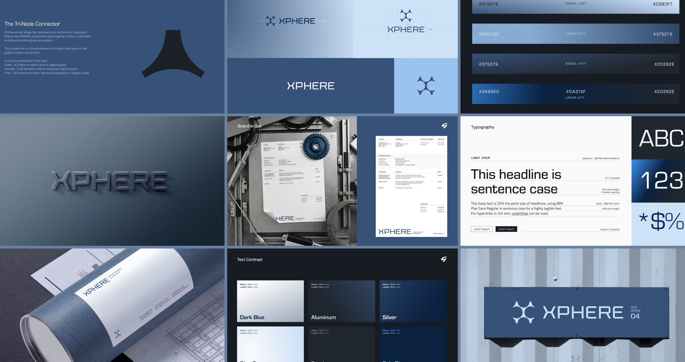 We developed a modular visual system built on one core geometric element: the Tri-Node Connector, which embodies their core values of modularity, precision, intelligent integration, and upward movement. It works independently or combines to create flexible patterns, transforming from flat 2D meshes to dimensional 3D forms, mirroring how Xphere's components work as standalone parts or integrate seamlessly into larger systems. The Tri-Node also forms the logomark, unifying the entire visual language into a brand that feels premium and contemporary.