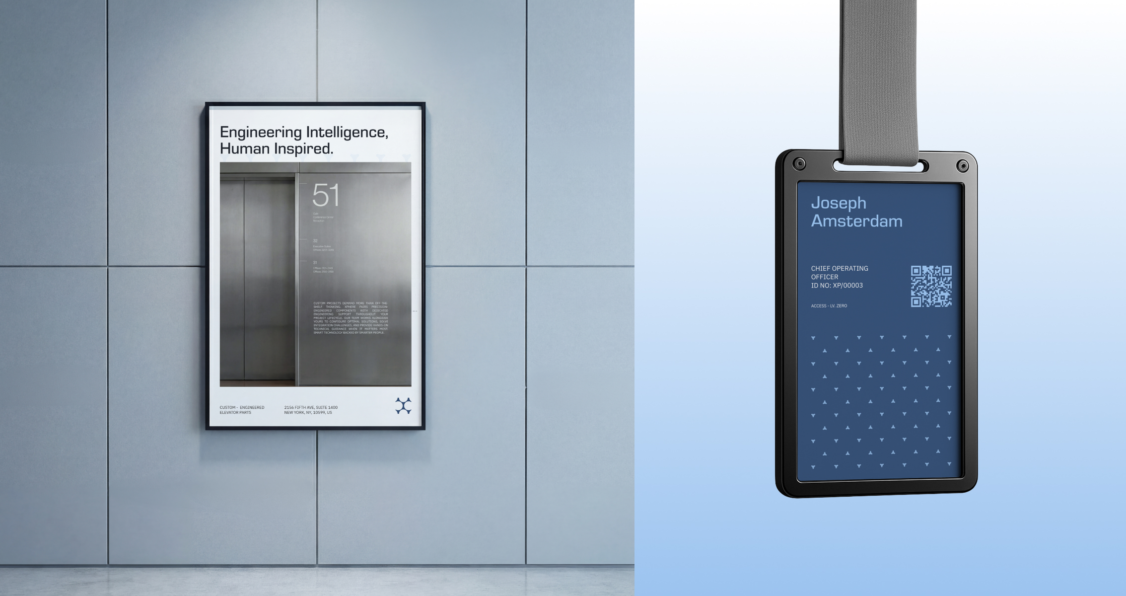 Operating within the often antiquated elevator industry, Xphere occupies the premium, tech-forward position with the brand promise: "The Intelligence of Elevation." They needed a visual identity that could differentiate their custom engineering and technical sophistication for a B2B audience that is accustomed to the generic.
